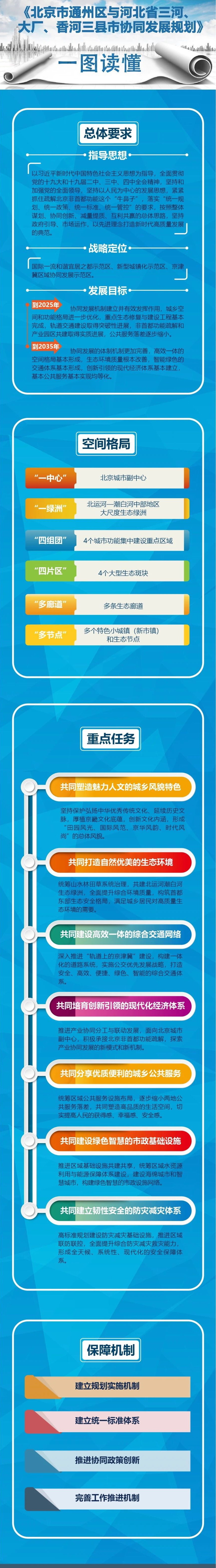 规划要求,建立统一规划管理机制,建立统一运维机制;建立统一标准体系,严格执行统一环保标准,高起点制定统一城市建设标准,高起点制定统一基本公共服务标准,统一社会保障标准;推进协同政策创新,完善生态环保支持政策,创新人口人才管理政策,建立统一互认的人才评价和行业管理政策,创新金融财税政策,支持通州区与北三县开展投融资改革试点;共享改革试点政策;完善工作推进机制。