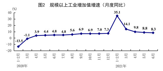 上半年,全国规模以上工业增加值同比增长15.9%,两年平均增长7.0%,比一季度加快0.2个百分点;其中二季度同比增长8.9%。6月份,规模以上工业增加值同比增长8.3%,两年平均增长6.5%;环比增长0.56%。分三大门类看,上半年采矿业增加值同比增长6.2%,两年平均增长2.5%;制造业增长17.1%,两年平均增长7.5%;电力、热力、燃气及水生产和供应业增长13.4%,两年平均增长6.0%。高技术制造业增加值同比增长22.6%,两年平均增长13.2%。分产品看,新能源汽车、工业机器人、集成电路产量同比分别增长205.0%、69.8%、48.1%,两年平均增速均超过30%。分经济类型看,国有控股企业增加值同比增长11.9%;股份制企业同比增长15.8%,外商及港澳台商投资企业同比增长17.0%;私营企业同比增长18.3%。6月份,中国制造业采购经理指数为50.9%,连续16个月高于临界点;企业生产经营活动预期指数为57.9%。