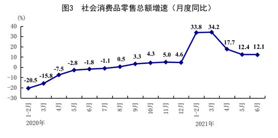 上半年,社会消费品零售总额211904亿元,同比增长23.0%,两年平均增长4.4%,比一季度加快0.2个百分点;其中二季度同比增长13.9%,两年平均增长4.6%。6月份,社会消费品零售总额37586亿元,同比增长12.1%,两年平均增长4.9%;环比增长0.70%。上半年,按经营单位所在地分,城镇消费品零售额184098亿元,同比增长23.3%,两年平均增长4.4%;乡村消费品零售额27807亿元,同比增长21.4%,两年平均增长4.0%。按消费类型分,商品零售190192亿元,同比增长20.6%,两年平均增长4.9%;餐饮收入21712亿元,同比增长48.6%,规模与2019年上半年基本持平。按商品类别分,限额以上单位18个商品类别同比增速均超过10%,其中七成以上商品类别同比增速超过20%。从两年平均增速看,除石油类商品外,其他商品类别商品零售额均为正增长,其中体育娱乐用品类、通讯器材类、化妆品类、文化办公用品类等9类商品零售额两年平均增速超过10%。全国网上零售额61133亿元,同比增长23.2%,两年平均增长15.0%,比一季度加快1.5个百分点。其中,实物商品网上零售额50263亿元,增长18.7%,两年平均增长16.5%,比一季度加快1.1个百分点;实物商品网上零售额占社会消费品零售总额的比重为23.7%,比一季度提高1.8个百分点。
