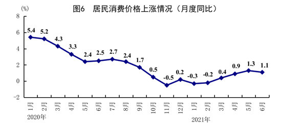 上半年,全国居民消费价格(CPI)同比上涨0.5%,一季度同比持平。其中,6月份全国居民消费价格同比上涨1.1%,涨幅比5月份回落0.2个百分点;环比下降0.4%。上半年,城市居民消费价格上涨0.6%,农村居民消费价格上涨0.4%。分类别看,食品烟酒价格同比上涨0.4%,衣着价格同比持平,居住价格上涨0.2%,生活用品及服务价格上涨0.1%,交通通信价格上涨1.9%,教育文化娱乐价格上涨0.9%,医疗保健价格上涨0.3%,其他用品及服务价格下降1.1%。在食品烟酒价格中,猪肉价格下降19.3%,粮食价格上涨1.2%,鲜果价格上涨2.6%,鲜菜价格上涨3.2%。扣除食品和能源价格后的核心CPI上涨0.4%,一季度为同比持平。