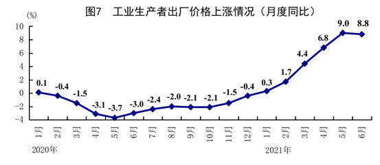 上半年,全国工业生产者出厂价格同比上涨5.1%,涨幅比一季度扩大3.0个百分点;其中6月份同比上涨8.8%,涨幅比5月份回落0.2个百分点。上半年,全国工业生产者购进价格同比上涨7.1%,涨幅比一季度扩大4.3个百分点;其中6月份同比上涨13.1%,环比上涨0.8%。