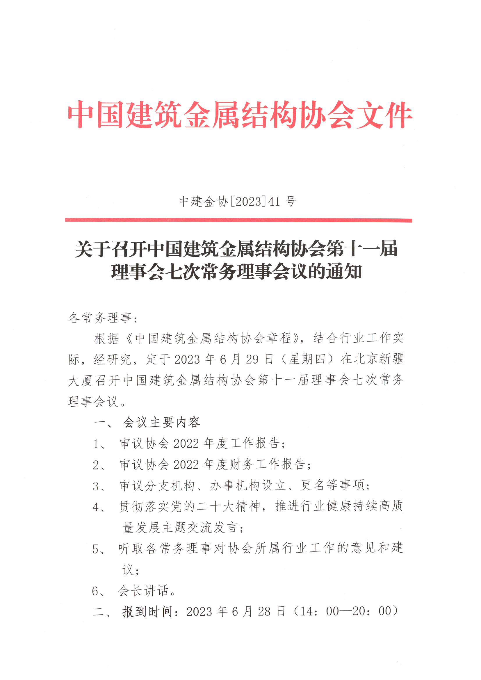 关于召开中国建筑金属结构协会第十一届理事会七次常务理事会议的通知