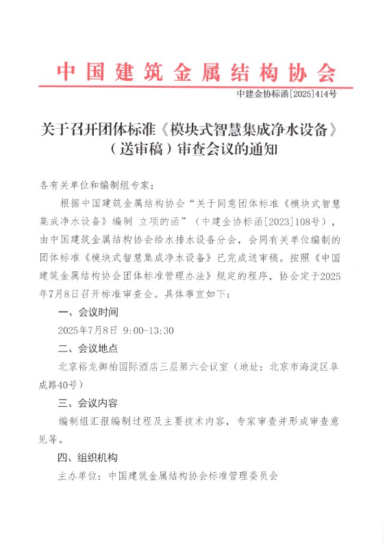 关于召开团体标准《模块式智慧集成净水设备》(送审稿)审查会议的通知