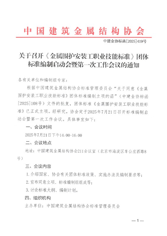 关于召开《金属围护安装工职业技能标准》团体标准编制启动会暨第一次工作会议的通知