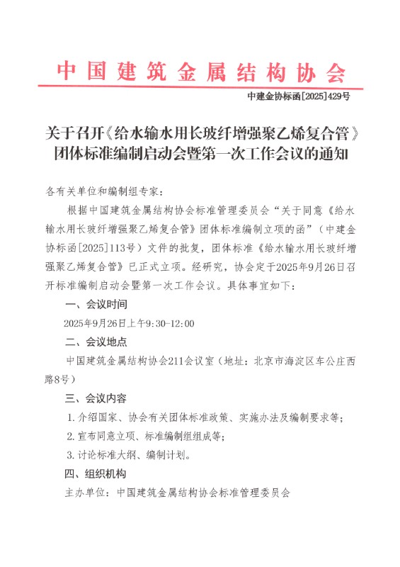 关于召开《给水输水用长玻纤增强聚乙烯复合管》团体标准编制启动会暨第一次工作会议的通知