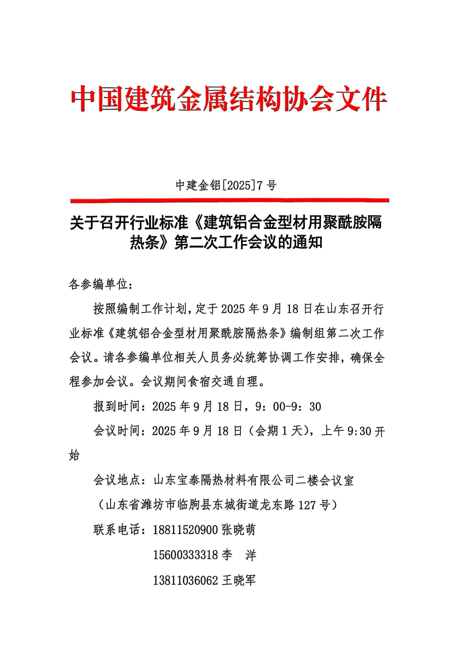 关于召开行业标准《建筑铝合金型材用聚酰胺隔热条》第二次工作会议的通知