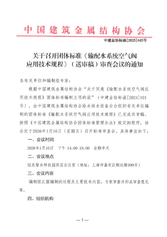 关于召开团体标准《输配水系统空气阀应用技术规程》(送审稿)审查会议的通知