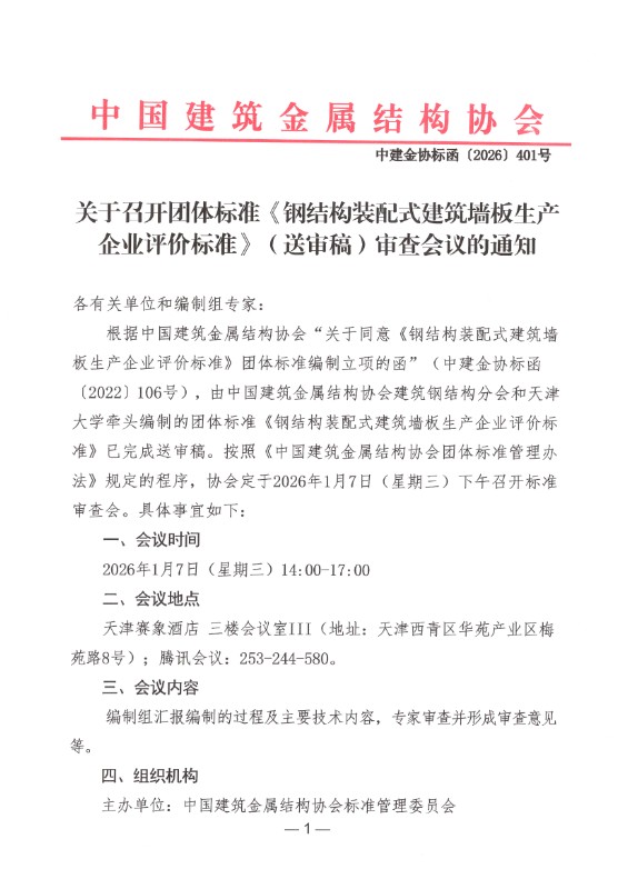 关于召开团体标准《钢结构装配式建筑墙板生产企业评价标准》(送审稿)审查会议的通知