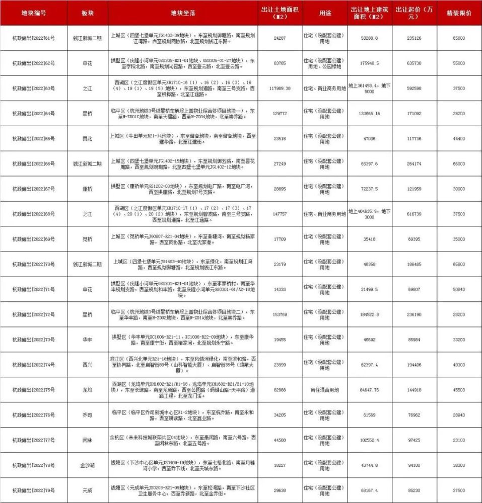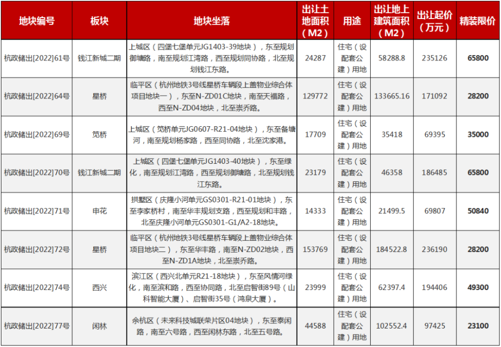 杭政储出[2022]62号庆隆小河单元GS0305-R21-01地块、GS0305-G1-27地块,东至学院北路,南至规划沁园路,西至登云路,北至登云路,精装限价55000元/平米。